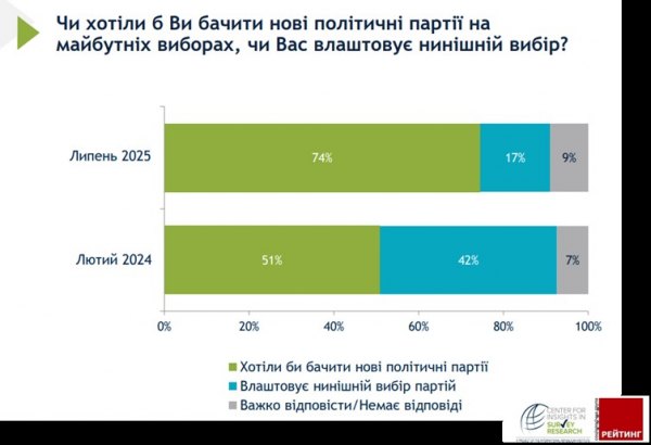 Опитування, яке провів "Рейтинг" на замовлення Міжнародного республіканського інституту (IRI) свідчить, що запит громадян на нові політичні партії стрімко зріс за півтора роки. Якщо на початку 2024 року майже кожного другого українця цілком влаштовували наявні партії, то наразі майже 75% хочуть бачити нові політичні сили.