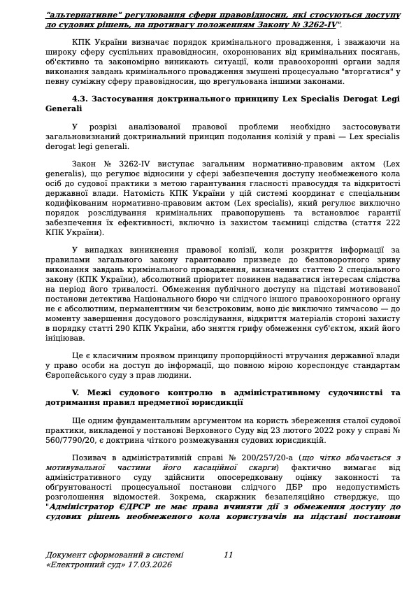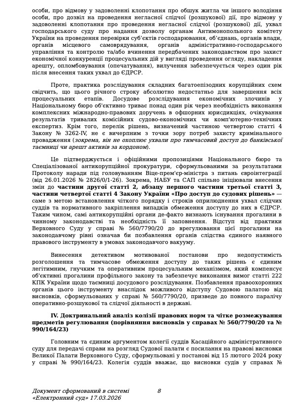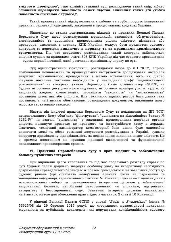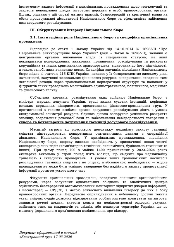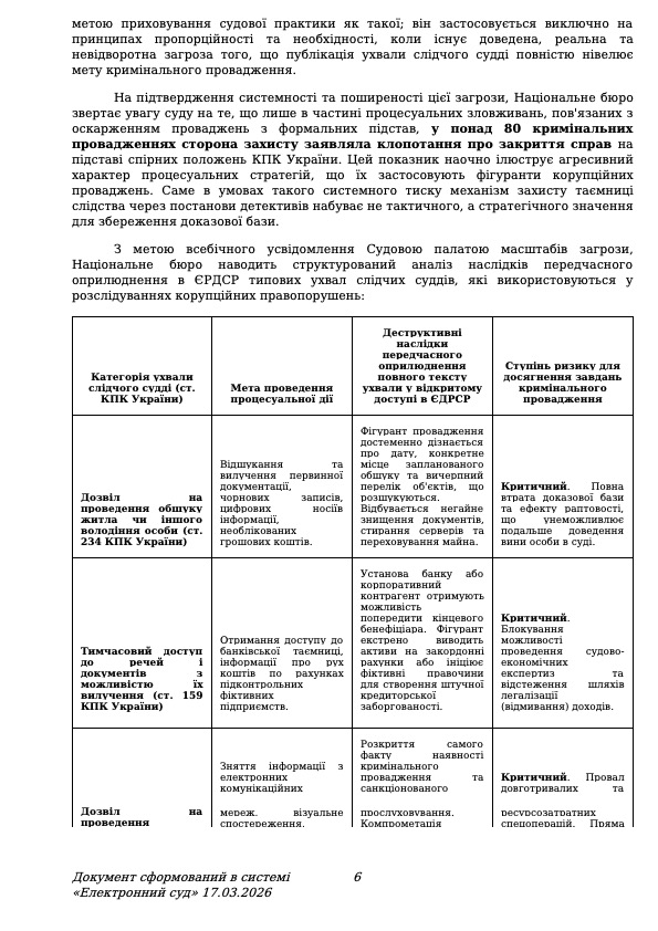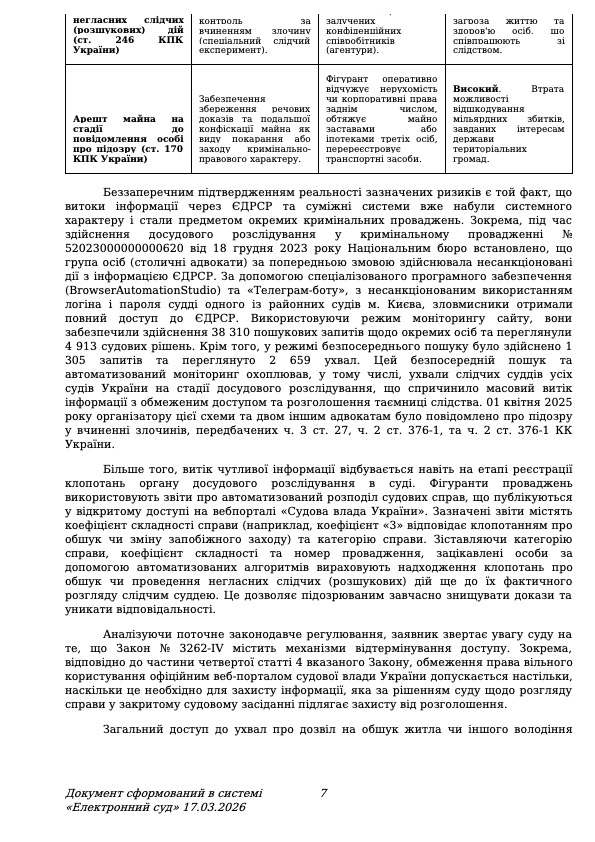 "Якби доступ про проведення ухвал про проведення негласних слідчих дій чи обшуків щодо високопосадовців, які підозрюються у розкраданні мільярдних бюджетних коштів ід час воєнного стану залишався відкритим (або публікувався на наступний день, як того імперативно вимагає загальне правило Закону N3262-IV), жоден топ-корупційний злочин не був би розкритий, а жодна гривня не була б повернута до державного бюджету."