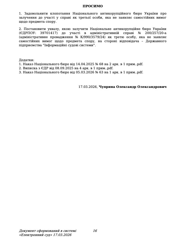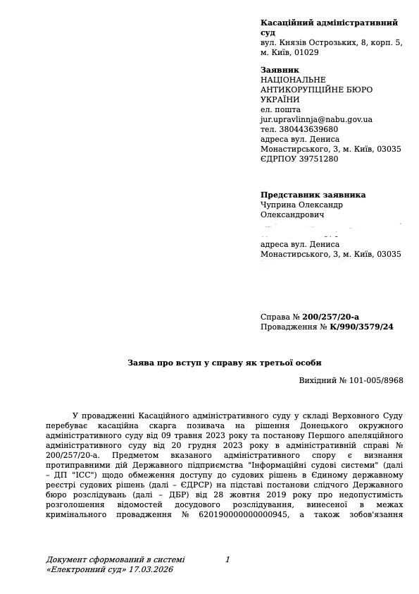 І штучний інтелект від імені та в інтересах Національного антикорупційного бюро України подав заяву про вступ у справу як третьої особи, яка, щоправда, не заявляє самостійних вимог щодо предмета спору.