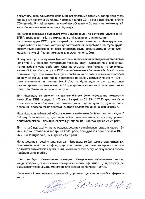 Вважаю, що підрозділ ДК-8, так званий "підрозділ Касьянова", був ліквідований у зв'язку з моєю діяльністю щодо розкриття кричущих фактів корупції при закупівлі дронів FP-1 компанії Fire Point.