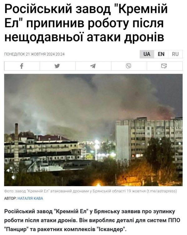 1. Успішна атака найбільшого заводу мікроелектроніки "Кремній Ел" в ніч на 19 жовтня 2024 року. Завод після цієї атаки зупинив свою роботу. За доказами ходити далеко не треба – їх повно в інтернеті. Є також супутникові знімки.