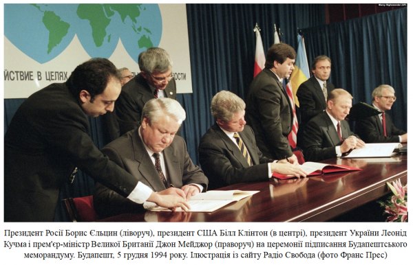 Третім міжнародним договором – Будапештським меморандумом – Росія, США, Велика Британія, Франція і Китай надали Україні гарантії її безпеки і територіальної цілісності в обмін на її зобов'язання позбутися ядерної зброї і на її приєднання до Договору про нерозповсюдження ядерної зброї як держави з без'ядерним статусом.