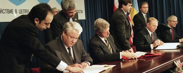 Згідно із договором, який отримав умовну назву "Будапештський меморандум", Росія, США, Велика Британія, Франція і Китай надали Україні гарантії її безпеки і територіальної цілісності в обмін на її зобов'язання позбутися ядерної зброї та приєднання до Договору про нерозповсюдження ядерної зброї як держави з без'ядерним статусом.