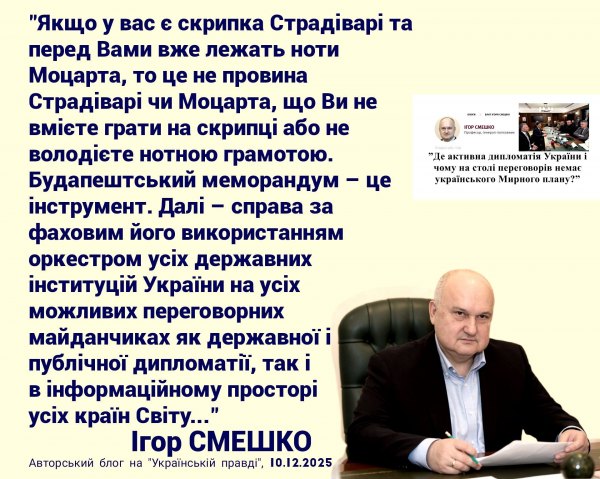 Невже до цього часу не зрозуміло, що будь-які заяви з української сторони, які підривають довіру та ігнорують цей повноцінний і діючий міжнародний договір, є прямим сприянням країні-агресору. Фактично це підігрування Кремлю у його спробі зробити вигляд, що цей договір не має для нього обов'язкової юридичної сили і ухилятися від відповідальності за агресію проти України. Кремль і так робить усе можливе, щоби виключити "тему меморандуму" з міжнародного порядку денного і уникати дискусій на тему руйнації ним СИСТЕМИ міжнародного права у зв'язку із невиконанням безпекових зобов'язань. (https://blogs.pravda.com.ua/authors/smeshko/68ff681c23932/)